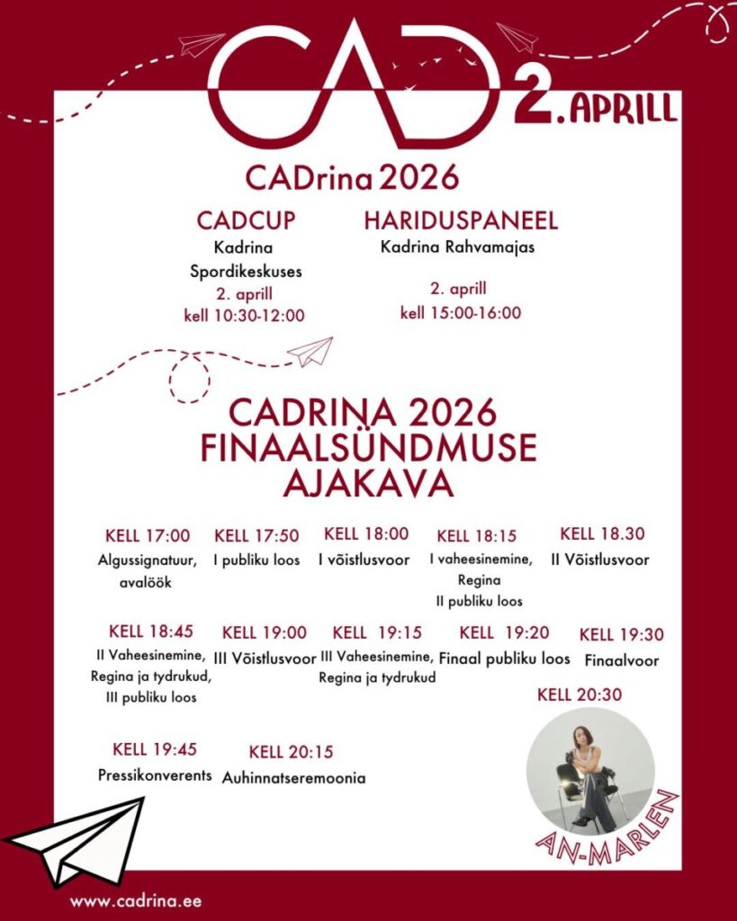 Täna, 2. aprillil toimub Kadrinas CADrina arvutijoonestusvõistluse finaalsündmus, kuhu on oodatud kaasa elama kõik huvilised. Finaal algab kell 17.00 Kadrina Huvikeskuses ning pakub põnevat ja inspireerivat vaatemängu, kus selguvad parimad noored arvutijoonestajad. Tänavuse arvutijoonestusvõistluse teemaks on mehitamata õhusõidukid.