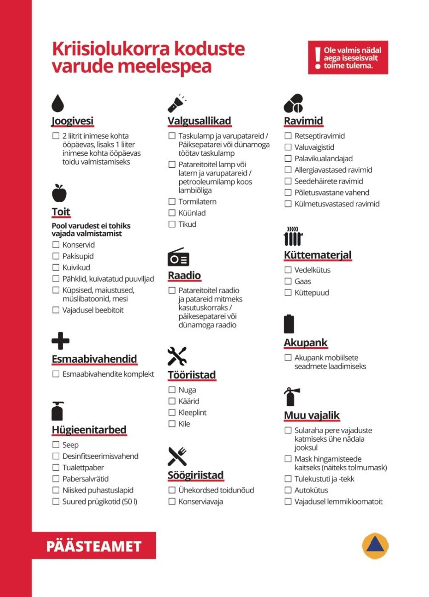 Kriisiolukorra koduste varude meelespeale saad pilgu peale heita alloleva lingi kaudu.