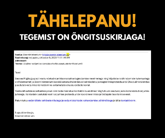 Viimastel nädalatel on sagenenud juhtumid, kus petturid saadavad haridusasutustele Siseministeeriumi nimel õngitsuskirju. Kirjades viidatakse väidetavale „varjumise korraldamisele kooli territooriumil" ning küsitakse täiendavat teavet või suunatakse linkidele.