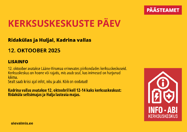 Tule kerksuskeskuste infopäevale 12. oktoobril, kus tutvustatakse, mis kohad need on ja kuidas kriiside ajal (nagu pikemaajalised elektrikatkestused) abi ja infot saab. Kadrina vallas...